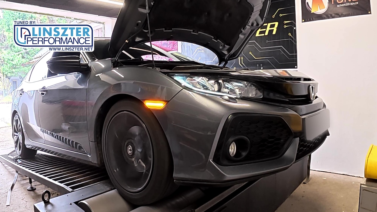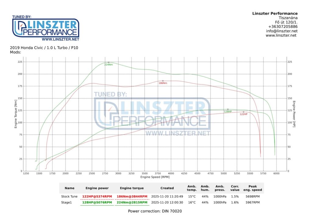 Program fejlesztésre hozta az Origin Cars ezt a 10. generációs Civic 1.0 Turbót. Az autóban 250ezer km van és egy egyedi intake-en kívül teljesen gyári. Gyári programmal az autó mindössze 122LE-t és 186Nm-t tudott. Érdekesség, hogy a fojtószelep padlógázon 1500-as fordulatszámnál mindössze 55%-ot nyit, majd szinte lineárisan nyitja és csak 5300-as fordulatszámon nyit 100%-ot. A töltőnyomás 1.5bar 4100-as fordulatszámon és 3500-as fordulatig szegényen tarja a keverék arányt még akkor is ha már 1.4bar a töltőnyomás. Egy korábbi szoftver verzióhoz volt már „Stage1” fájlom ami 150LE-t és 250Nm-t „ígér”, de ez az autó már egy frissített verzióval érkezett, így némi időbe telt a különböző paramétereket megtalálni. Az első tesztnél sikerült 128LE-t és 224Nm-t elérni szinte fix 1.7bar-os nyomással, teljes tartományban 100%-os fojtószelep nyitással. Csúcsban ez mindössze +6LE és +38Nm, de a nyomatékcsúcs 3800-ról 2800-ra ment le és ott +19LE és +46Nm lett a különbség. 1.5fok plusz gyújtást próbáltunk 3500-as fordulat felett, amitől ugyan jött még +2LE, viszont 4200-nál lett egy gyújtás kimaradás. Ezután próbálkoztunk még párszor, de az ígért 150LE és 250Nm egyelőre sehogy se mutatkozott. Nyomást emelni nem akartunk, gyújtásra pedig nem reagált jól az autó, így abban maradtunk, hogy némi program fejtegetés után újra tesztelünk és meglátjuk sikerül-e többet kihozni.