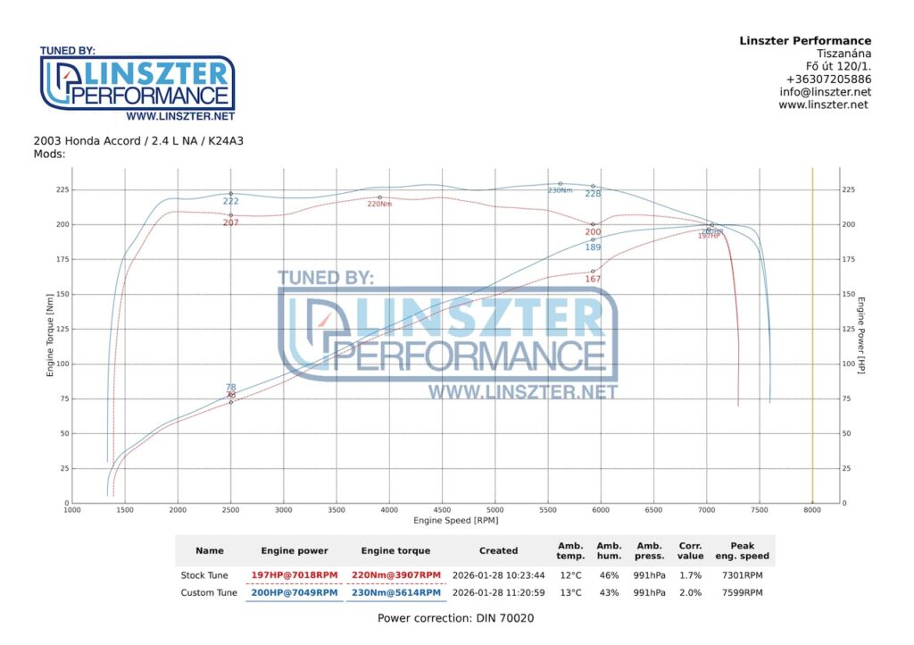 A direktszűrőnek köszönhetően már gyári programmal 197LE-t és 220Nm-t tudott az autó. A programozás során 200LE-t és 230Nm-t sikerült kihozni, ami bár csúcsban nem sok, de 2500-as fordulatnál +5LE és +15Nm, a gyári VTEC váltásnál pedig +22LE és +28Nm. Tiltás 7600-ig lett kitolva és kapott kapcsolható pops and bangs-et.