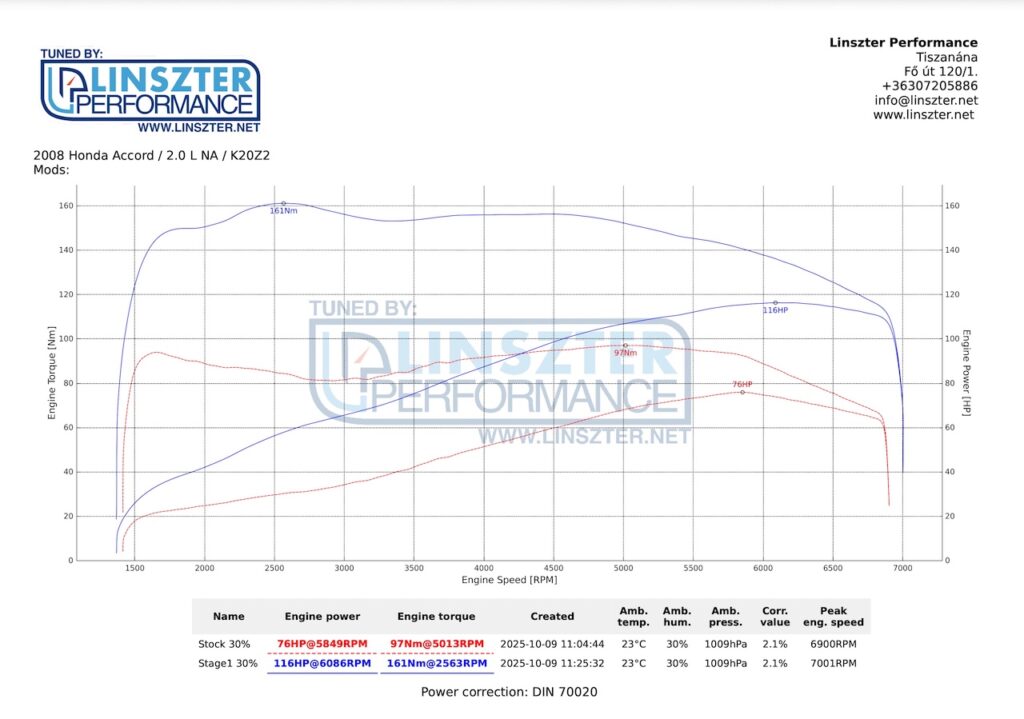 Egy 7. generációs Honda Accord érkezett programozásra, 2 literes K20Z2 motorral, ami már elektromos fojtószeleppel rendelkezik. Ezeknél a típusoknál a gázpedál karakterisztika javításával többet lehet elérni részterhelésen, mint amennyit padlógázon. Korábban már csináltam szemléltető teszteket 8. generációs illetve 9. generációs Civicnél is, így gondoltam csináljuk ennél az Accordnál is. Első körben padlógázon mértünk egyet gyári programmal, amivel 154LE-t és 184Nm-t produkált az autó. Ezután a szokásos módon a gyári program úgy lett módosítva, hogy a fojtószelep vezérlése lett limitálva azokra az értékekre, amit 30%-os gázpedál állásnál céloz az ECU (Mintha 30%-on tartanánk a gázpedált). Itt ez úgy néz ki, hogy 40km/h sebességig 10.2% majd 19,74%-ra emelkedik 160km/h sebességnél. Ezzel a beállítással 76LE-t és 97Nm-t produkál az autó. 1500-as fordulatról 6900-ig 26 másodperc kellett, hogy leforogjon 4. fokozatban. Ezután felkerült a módosított program, szintén limitálva a fojtószelepet, de itt már 40km/h sebességig 27%-ról indul és 29%-ig emelkedik. Ezzel a beállítással 116LE-t és 161Nm-t produkált és 1500-as fordulatról 7000-es tiltásig 14 másodperc alatt forgott le. A görbén sokkal jobban látható a különbség. Íme a különbségek adott fordulatszámokon ezzel a 30%-os gázpedál állással:
