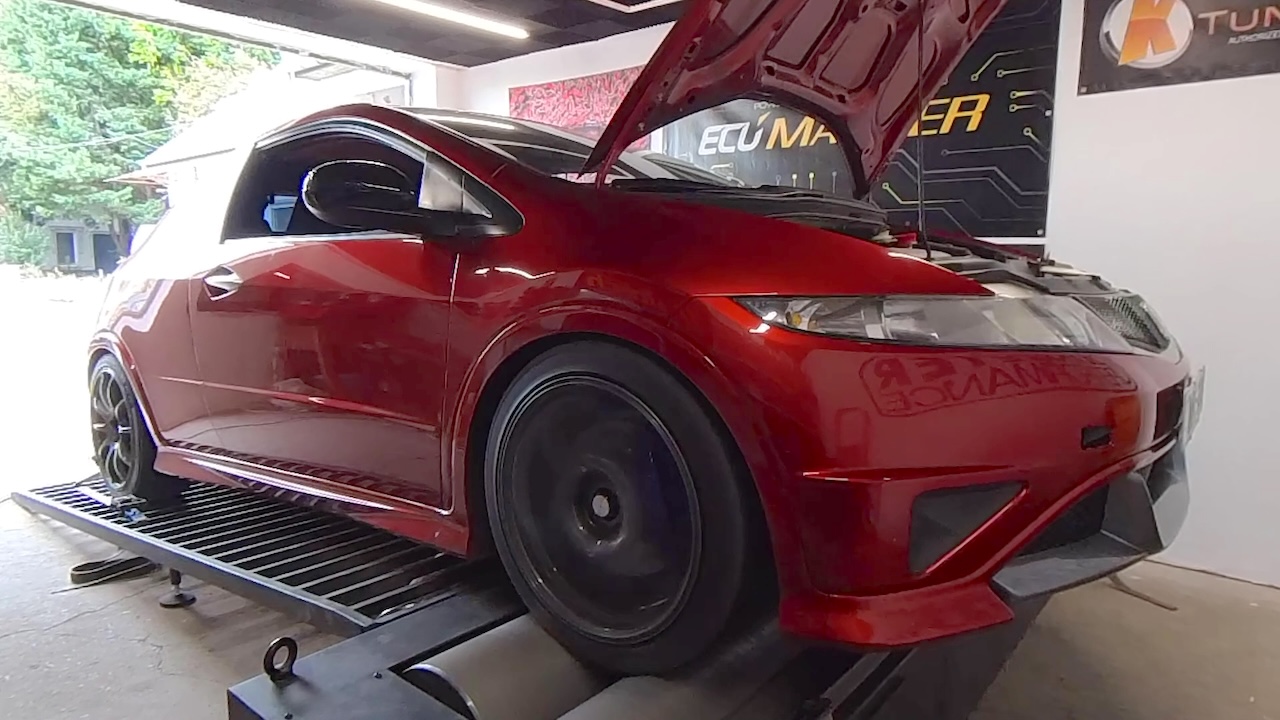 Egy egészen érdekes autó érkezett programozásra. Ez a 2009-es Honda Civic anno 1.8 Type-S-ként látta meg a napvilágot, de azóta kapott komplett Type-R külsőt és belsőt, viszont egy 2.4 literes Acura TSX motort kapott. Hogy az egész működjön, elsőre elküldték az ECU-t valakikhez, ahol kapott valami „Mugen” programot az ECU, amivel az autó totál használhatatlan volt. Ha már nálam járt, akkor gondoltam kiolvasom és vetek rá egy pillantást. Módosítva voltak a Closed Loop / WOT paraméterek, kikapcsolva egy rakat paraméter (Égéskimaradás, Immo, Olaj szint szenzor, 2-es szonda, kopogás érzékelő …stb), a gyújtás VTEC-ben padlógázon 30 fokra fixálva, Revlimit 11000rpm, VTEC 4000rpm-en fixálva…stb. Kétlem, hogy ez „Mugen” program lenne, de ha az is lenne, ehhez a setuphoz amúgy se lenne jó. Az autón egyébként van egy egyedi intake, leömlő és egy Miltek kipufogórendszer. Programozás végére 215LE-t és 250Nm-t sikerült elérni. A max fordulat 7600 maradt, mivel a gyári olajpumpa is maradt amit nem célszerű feljebb forgatni.