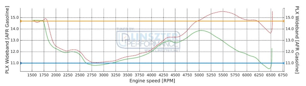 Mérésre érkezett ez a Lexus IS200 Turbo. Gyári ECU-val állítólag sokan használják 0.5-0.6bar-os nyomással. Bár nagyobb (1JZ) injektorok vannak, a keverék így is messze van az ideálistól. Az üzemanyag korrekciók részterhelésen -20% körül mozognak, de padlógázon fix -5.5%, mivel itt már nincs lambda szabályzás. 2700-tól 3200-ig dús a keverék, majd kb. 4000-től tiltásig már rettentően szegény, 5500-on 15.5 az üzemanyag arány 0.6bar-os nyomáson. 0.3bar-nál egy fokkal jobb a helyzet, ott „csak” 4000-től 6000-ig szegény a keverék, 6200 felett pedig már dús, a legszegényebb pont 5000-nél 13.9-es üzemanyag arány.