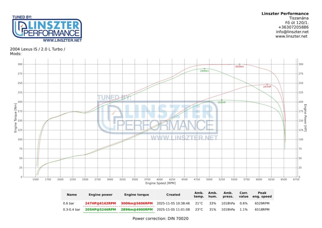 Az autó 0.6 bar-on 247LE-t és 300Nm-t produkált, 0.3bar nyomáson (0.4-re felugrik, de vissza is esik 0.3-ra) pedig 205LE és 289Nm-t. Tervben van minimum egy piggyback ecu, hogy ezt az üzemanyag problémát orvosolni lehessen.