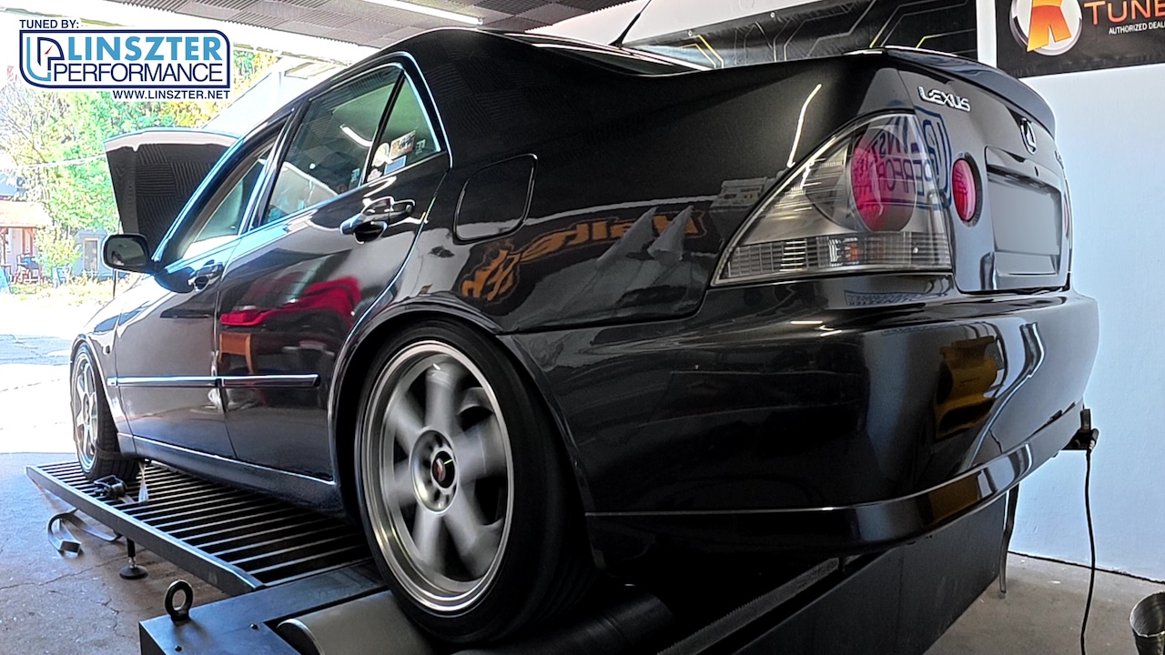 Mérésre érkezett ez a Lexus IS200 Turbo. Gyári ECU-val állítólag sokan használják 0.5-0.6bar-os nyomással. Bár nagyobb (1JZ) injektorok vannak, a keverék így is messze van az ideálistól. Az üzemanyag korrekciók részterhelésen -20% körül mozognak, de padlógázon fix -5.5%, mivel itt már nincs lambda szabályzás. 2700-tól 3200-ig dús a keverék, majd kb. 4000-től tiltásig már rettentően szegény, 5500-on 15.5 az üzemanyag arány 0.6bar-os nyomáson. 0.3bar-nál egy fokkal jobb a helyzet, ott „csak” 4000-től 6000-ig szegény a keverék, 6200 felett pedig már dús, a legszegényebb pont 5000-nél 13.9-es üzemanyag arány.