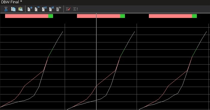 Alaphelyzetbe állított értékeknél már egészen más a helyzet, így már szinte alig van különbség. Ennél az adott autónál persze volt más érdekesség is. Intake miatt a MAF paraméterek módosítva lettek, de akkora %-os ugrások voltak egy 0.03V-os változásra is, hogy a fuel trim is csak úgy ugrált. Egy adott paraméter nem is lett változtatva, így alacsonyabb fordulaton, padlógáznál az üzemanyagarány 11.0 alá esett, egy másik paraméter miatt pedig, magas fordulaton 11.9 alá. A kopogás szenzor érzékenysége volt 10%-al módosítva, hogy kevésbé érzékelje a kopogást, ami a legrosszabb megoldás és kizárólag egy versenyautónál lehet szükséges, ahol a nagyobb rezonancia miatt a szenzor fals kopogást jelez. Emellett mindössze +2fok gyújtás volt hozzáadva a gyújtás táblához padlógázon, +2fok a Knock Limithez szintén padlógázon, és 5fok el lett véve a Knock Retard táblából szintén padlógázon. EGR pedig kikapcsolva, aminek ezeknél az égvilágon semmi értelme, hacsak nem egy szétkopott, olaj zabáló motorról van szó, bár azt nem tuningolni kéne, hanem felújítani. Cserébe a tulaj alig tudta leműszakiztatni az autót az EGR kikapcsolás miatt. A gázpedál karakterisztika is érdekes volt.