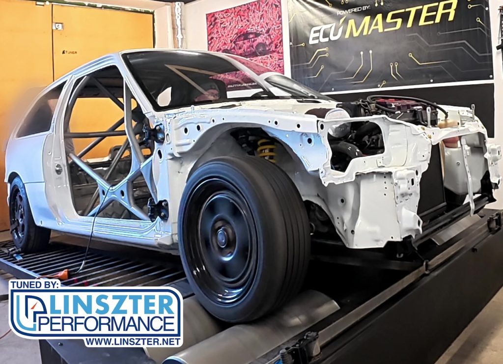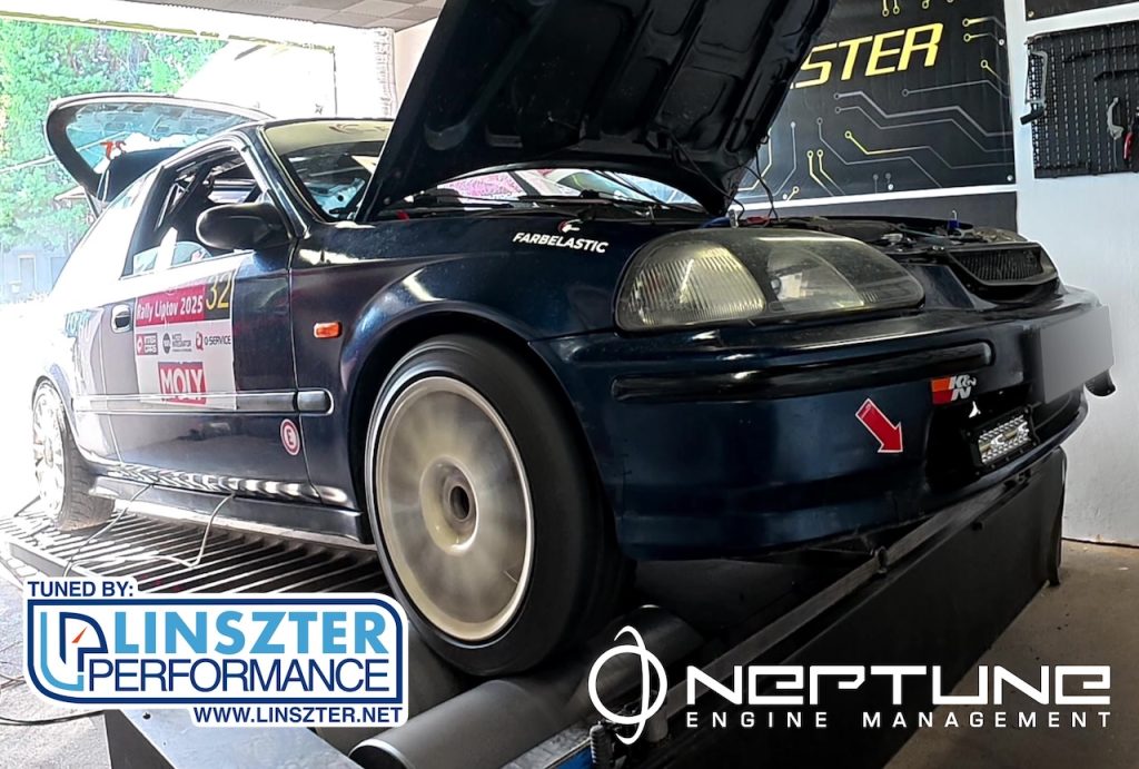 Jani még tavaly volt itt ezzel az autóval. Vagyis, abból az autóból kikerült a B16 és egy B18 került a helyére. Viszont az a B16 motor most egy új 4G Civic kasztniba került (természetesen nem ez a végleges külső) és a Skunk2 leömlőt egy Tegiwa váltotta fel, minden más maradt. A programon sikerült javítani kicsit, főleg VTEC felett, 208LE és 178Nm a vége.