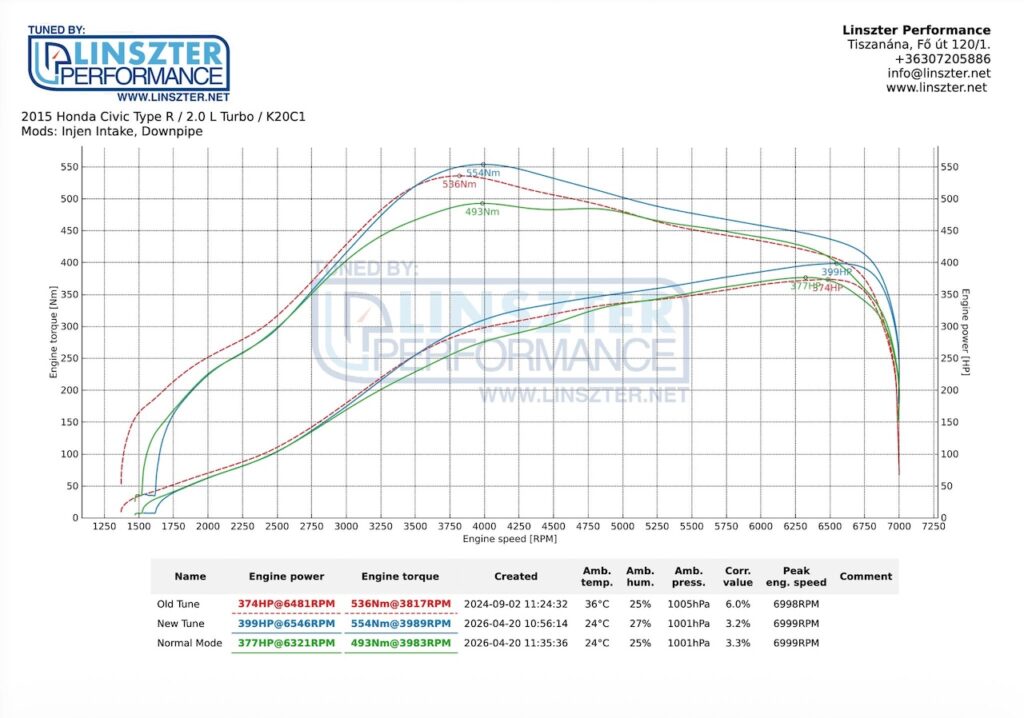 Korábban már volt nálam ez az autó többször is. Legutoljára 2024-ben 374LE-t és 536Nm-t tudott egy Injen Intake-el és Downpipe-al. Azóta új tulajdonosa lett és kapott egy intercoolert, kipufogórendszert és turbo chargepipe-ot. Ezekkel a módosításokkal alapból 9LE-vel többet tudott az autó, de azért egy kicsit módosítottam a programon. Normal módban visszább lett véve a nyomaték cél egy kicsit, így 377LE-t és 493Nm-t produkált az autó. R móde-ban picit növeltünk rajta, így 399LE és 554Nm lett a végeredmény.
