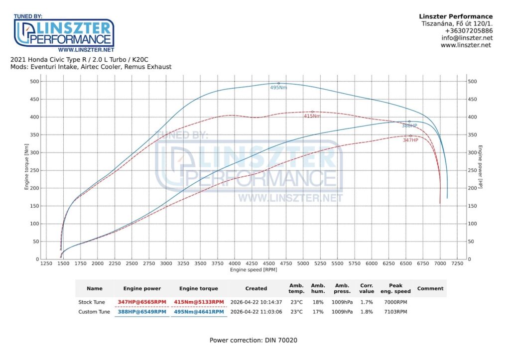 Egy 2021-es Honda Civic FK8 Type-R érkezett programozásra. Az autó kapott egy Eventuri Intake-et, Airtec Coolert és Remus kipufogót. Gyári programmal 347LE-t és 415Nm-t tudott az autó. A cél nem egy maximumra kihegyezett autó volt, hanem egy szolidabb extra teljesítmény. A végeredmény 388LE és 495Nm. Kérésre a Start/Stop ki lett kapcsolva és 4000-es fordulat felett kapott egy szolidabb és rövidebb „pops and bang-et”.